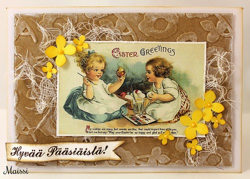 Sain valmiiksi tänään viimeisen pääsiäiskorttini ja tämännäköinen siitä tuli. Kuvan alle laitoin kohokuvioidun kartongin. Kohokuvioin ekokartongin ja hieroin kohokuvioinnin päälle Faber-Castellin Coconut väristä Gelatosväriä. Vintage easter leikekuva on Reprintiltä.